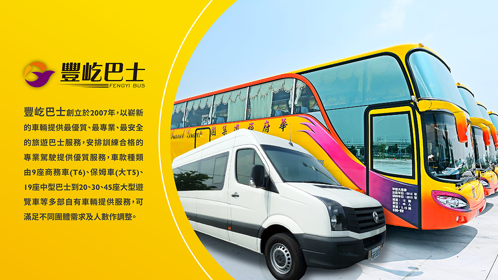 豐屹巴士成立逾十年,其下兩大品牌「狄成遊覽車」及「駿成小客車」,提供全頂級包車服務,量身訂做包車旅遊 !當您需要商務包車、台灣包車旅遊、機場接送、高鐵站接送、商務接送、一日遊、台灣自由行接送…等服務,我們都秉持服務的心幫您完成。 您的支持是我們服務提昇的動力,歡迎您的搭乘及指教。